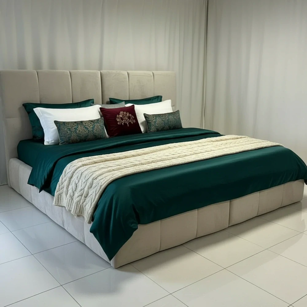 Dominantou tejto postele je vysoké čelo s výškou 155 cm, ktoré zdobia elegantné prešívané kocky – detail, ktorý dodáva spálni noblesu a moderný charakter. Rám s 10 cm širokými okrajmi vytvára dokonalý vizuálny balans medzi robustnosťou a eleganciou.