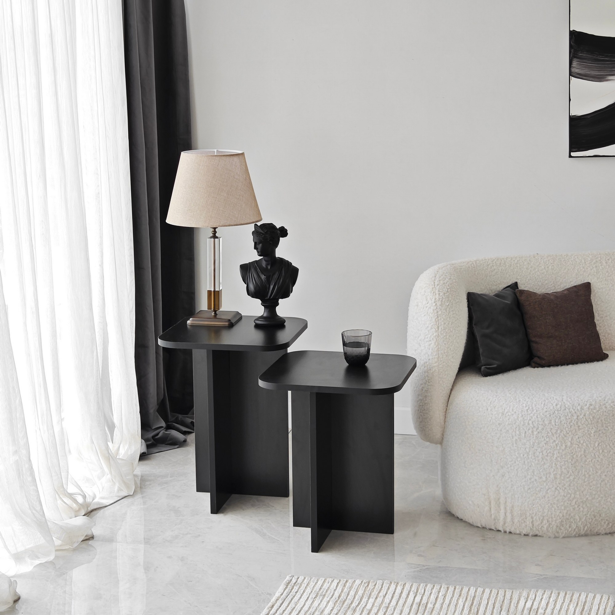 Pridajte do svojho domova nádych modernosti a štýlu s touto elegantnou a súčasnou súpravou bočných stolíkov. Čierna farba dodáva každému priestoru nádych sofistikovanosti, zatiaľ čo čisté línie a minimalistický dizajn robia z týchto stolíkov všestranný doplnok k akémukoľvek štýlu dekorácie.